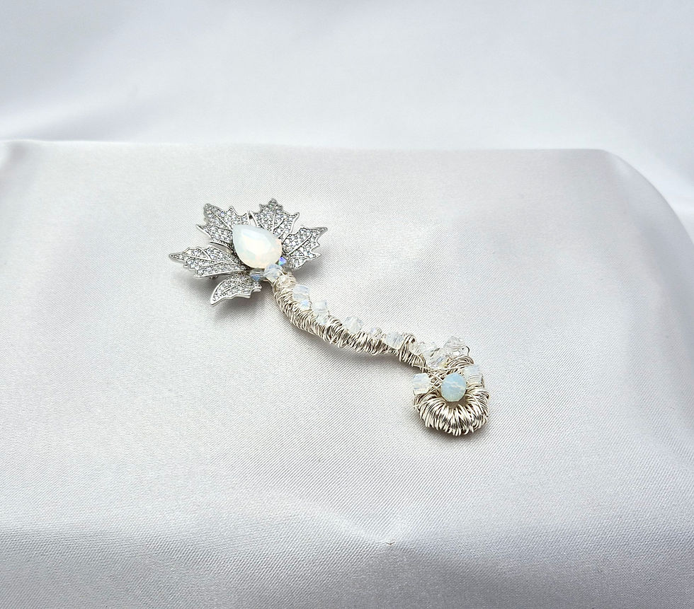 White Opal Crystal Silver Grooms Maple Leaf-Shaped Boutonniere